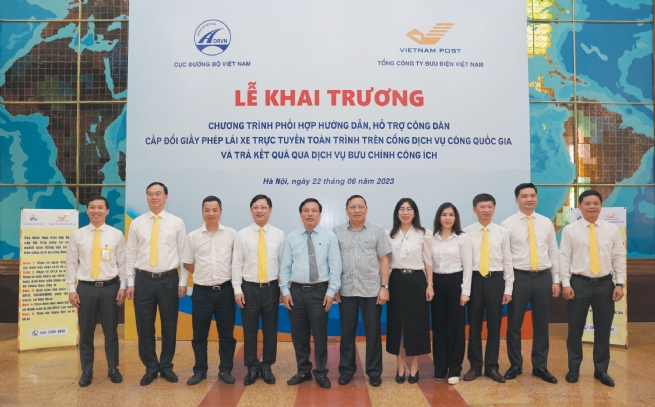 Lãnh đạo Tổng Công ty Bưu điện Việt Nam, Bưu điện TP.Hà Nội và Cục Đường bộ Việt Nam tại Lễ khai trương chương trình phối hợp hướng dẫn, hỗ trợ công dân cấp đổi giấy phép lái xe trực tuyến toàn trình trên cổng dịch vụ công Quốc gia và trả kết quả qua dịch vụ Bưu chính công ích