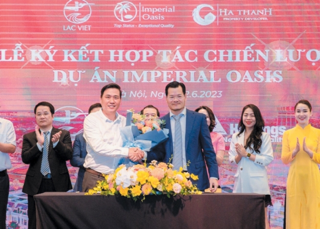 Ông Cao Tùng Lâm, Chủ tịch HĐQT Công ty An Phú Hưng (áo trắng) - đại diện Công ty ký kết hợp tác với các đối tác tham gia thực hiện Dự án Imperial Oasis