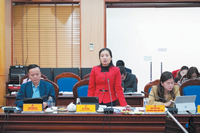 Giám đốc Sở Tư pháp Bắc Kạn - bà Hà Thị Đào báo cáo công tác phố biến, giáo dục pháp luật (PBGDPL) trên địa bàn tỉnh tại một cuộc họp với Hội đồng phối hợp PBGDPL Trung ương, tháng 11/2023