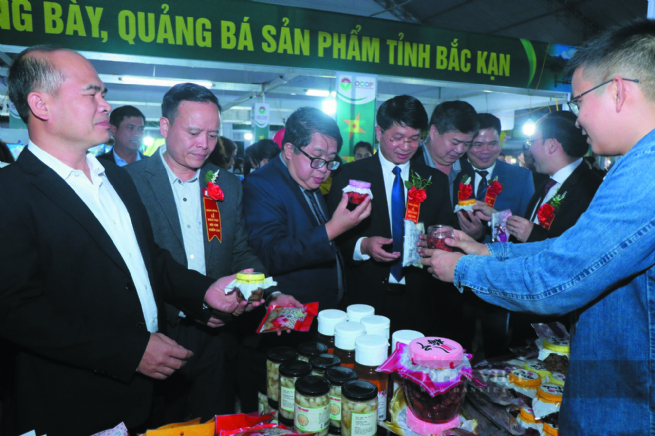 Các đại biểu tham quan một gian hàng tỉnh Bắc Kạn tại Hội chợ Công Thương khu vực Đông Bắc - Bắc Kạn năm 2023
