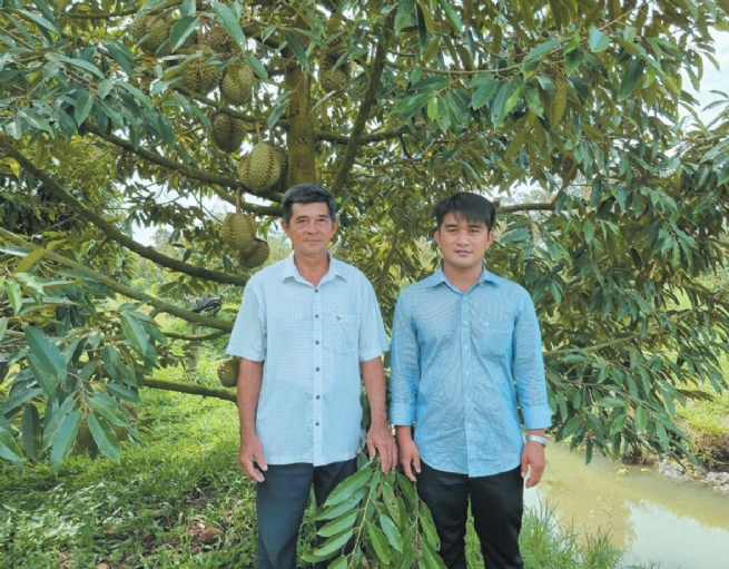 Ông Trần Văn Chiến - Chủ tịch HĐQT, Giám đốc Hợp tác xã vườn cây ăn trái Trường Khương A (bên trái) thăm vườn trồng sầu riêng của xã viên