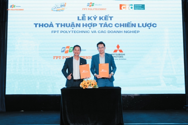 Thầy Trần Lý Anh Tuấn (bên trái), Hiệu trưởng Trường Cao đẳng FPT Polytechnic Cần Thơ ký thỏa thuận hợp tác với doanh nghiệp