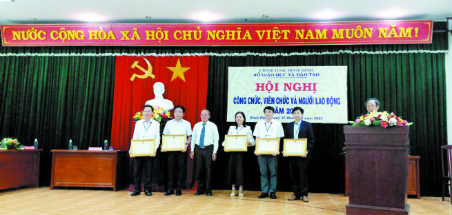 Lãnh đạo Sở Giáo dục và Đào tạo tỉnh Bình Định trao bằng khen của Chủ tịch UBND tỉnh cho các cá nhân xuất sắc