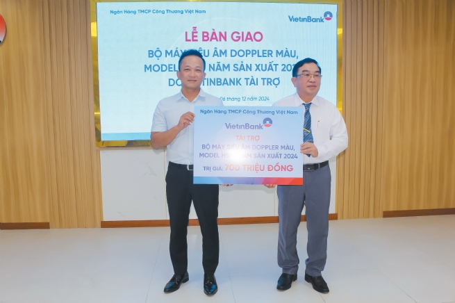 Ông Lê Thu Đông (bên trái), Giám đốc VietinBank Hậu Giang trao tặng bộ máy siêu âm Doppler màu cho Bệnh viện Đa khoa tỉnh để phục vụ công tác khám, chữa bệnh cho người dân