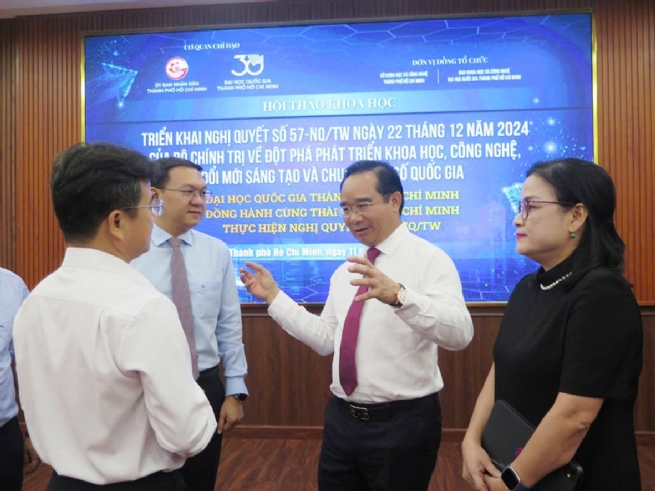 Ông Nguyễn Văn Được (thứ hai từ phải sang), Chủ tịch UBND TP.Hồ Chí Minh trao đổi với ông Lâm Đình Thắng (áo xanh), Giám đốc Sở KHCN TP.Hồ Chí Minh và các đại biểu tại Hội thảo khoa học về triển khai Nghị quyết số 57-NQ/TW của Bộ Chính trị
