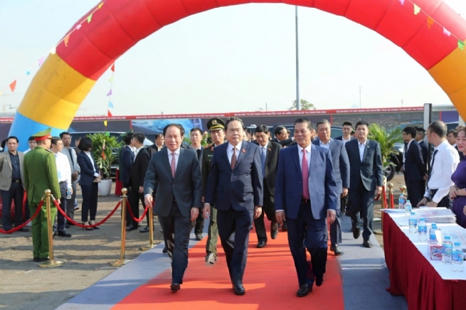 Ủy viên Bộ Chính trị, Chủ tịch Quốc hội Trần Thanh Mẫn cùng các đồng chí lãnh đạo TP.Hải Phòng và đại biểu dự lễ khởi công cầu Nguyễn Trãi