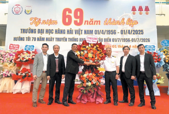 Hàng hải Liên Minh luôn gắn kết với các đơn vị đào tạo nhân lực ngành hàng hải. Trong ảnh: Lãnh đạo Công ty do Giám đốc Hoàng Văn Dương dẫn đầu chúc mừng 69 năm thành lập Trường Đại học Hàng hải Việt Nam
