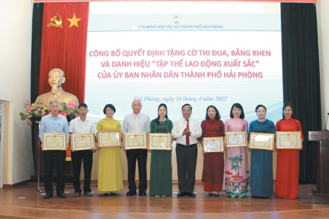 Bí thư Chi bộ, Chủ tịch HĐQT HTX An Hưng Đoàn Văn Kiểm (ngoài cùng bên trái) nhận Bằng khen “Tập thể lao động xuất sắc năm 2024” của UBND TP.Hải Phòng trao tặng