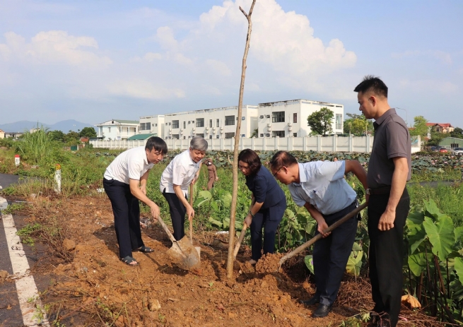 Lãnh đạo xã Kiều Phú tham gia trồng cây xanh trên các tuyến đường mới mở
