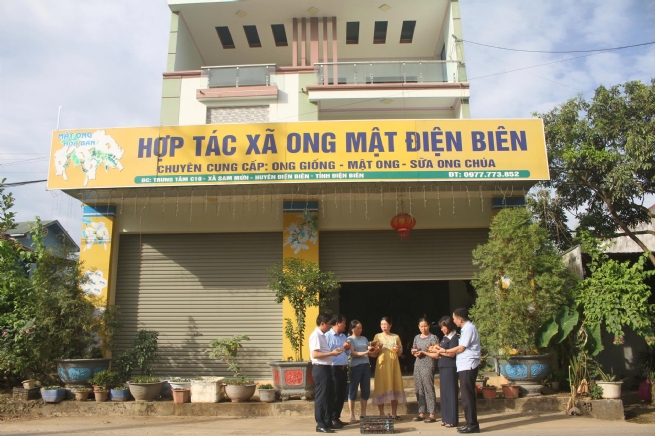 Đảng bộ, chính quyền xã luôn gắn bó, đồng hành cùng doanh nghiệp phát triển. Các thành viên HTX Ong mật Điện Biên đang giới thiệu sản phẩm mật ong đang xây dựng OCOP 5 sao (do Bộ Công Thương cấp) với Bí thư Đảng ủy xã Lò Hải Dung (thứ 1), Chủ tịch UBND xã Trần Văn Hải (thứ 3)