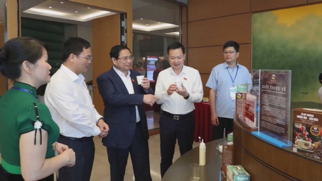 Thủ tướng Chính phủ Phạm Minh Chính thưởng thức cà phê Mường Ảng bên hành lang Quốc hội