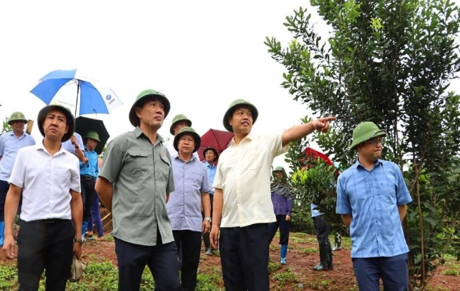 Phó Bí thư Tỉnh ủy Trần Tiến Dũng kiểm tra mô hình trồng cây mắc ca tại Pàng Dề B, xã Sáng Nhè (ngày 10/8/2025)