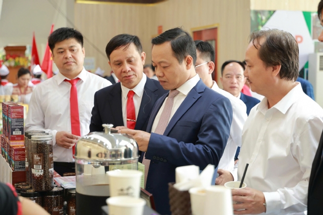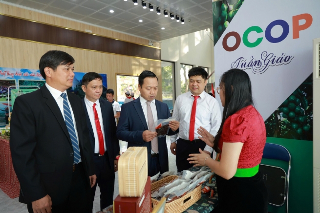 Lãnh đạo xã thăm gian hàng OCOP của xã Tuần giáo
