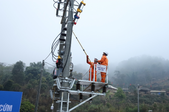 Công nhân đóng điện tại trạm biến áp tại bản Nặm Cứm, xã Ngối Cáy, huyện Mường Ảng