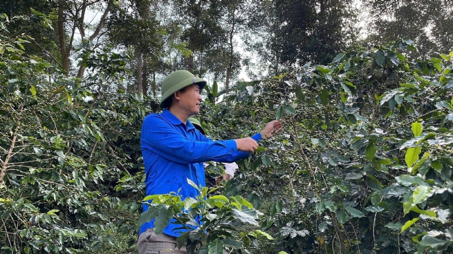 Với diện tích gần 40 ha, cà phê là một trong các cây trồng chủ lực của Phình Giàng, là cây thoát nghèo và làm giàu của nhiều hộ dân trong xã. Trong ảnh: Đồng chí Lê Văn Kha – Bí thư Đảng ủy xã kiểm tra tình hình vụ cà phê năm 2025