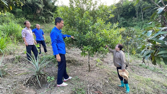 Cán bộ xã kiểm tra và hướng dẫn nhân dân chăm sóc cây mắc ca