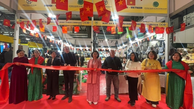 Khu trưng bày “Hà Nội - Việt Nam” có quy mô trên 100m2, được thiết kế mở, sang trọng, mang đậm bản sắc Á Đông đương đại. Đây không chỉ là không gian giới thiệu sản phẩm mà còn là cầu nối văn hóa, giúp khách tham quan châu Âu trực tiếp cảm nhận tinh hoa nghệ thuật và ẩm thực Việt Nam. 10 doanh nghiệp uy tín từ Hà Nội và các tỉnh thành đã mang đến sự đa dạng của các dòng sản phẩm thủ công mỹ nghệ tinh xảo như gốm sứ, lụa (thương hiệu Handysilk), mây tre đan, cùng các sản phẩm OCOP nông sản thực phẩm chất lượng cao như chè, cà phê, hạt điều, và các loại trái cây sấy. Sự hiện diện của các sản phẩm này, từ bàn tay người thợ làng nghề đến nông sản địa phương, đã khẳng định thông điệp về sự kết tinh giữa truyền thống và tiêu chuẩn xuất khẩu.