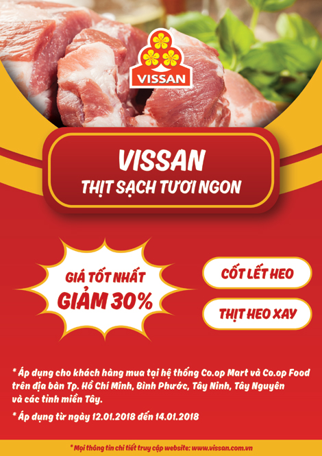 Nhằm cung cấp nguồn thịt heo chất lượng, an toàn cho người tiêu dùng, công ty VISSAN tiếp tục triển khai chương trình khuyến mãi giảm 30% thịt heo tươi sống tại hệ thống siêu thị Saigon Co.op (bao gồm Co.opMart và Co.opFood). Chương trình áp dụng tại hệ thống siêu thị Saigon Co.op (bao gồm Co.opMart và Co.opFood) trên địa bàn TP.HCM, Bình Dương, Bình Phước, Tây Ninh, Tây Nguyên và các tỉnh miền Tây.
