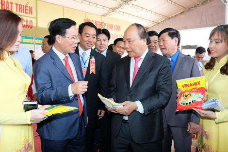 Thủ tướng Nguyễn Xuân Phúc thăm các gian hàng nông sản được trưng bày tại Hội nghị xúc tiến đầu tư của tỉnh Vĩnh Long. Ảnh: VGP/Quang Hiếu