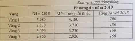 Cụ thể, theo phương án này, so với năm 2018, mức lương tối thiểu năm 2019 vùng 1 là 4.180.000 đồng, tăng 200.000 đồng, vùng 2 là 3.710.000 đồng, tăng 180.000 đồng, vùng 3 là 3.250.000 đồng, tăng 160.000 đồng, vùng 4 là 2.920.000 đồng, tăng 160.000 đồng.