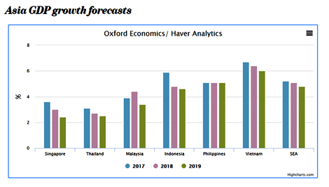 Tăng trưởng của khu vực dự kiến sẽ giảm nhẹ xuống 5,1% trong năm nay so với 5,2% của năm 2017, và sẽ tiếp tục giảm tương đối trong năm 2019 xuống 4,8% do nhu cầu nhập khẩu của Trung Quốc giảm nhẹ và sự gia tăng căng thẳng thương mại giữa Mỹ và Trung Quốc ảnh hưởng đến xuất khẩu và đầu tư của doanh nghiệp.