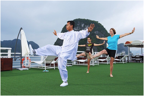Sau một đêm ngủ yên tĩnh trên tàu, du khách sẽ đón một ngày mới thứ 2 trên vịnh bằng hoạt động tai chi - thái cực quyền trên sundesk. Bình minh mang đến không gian trong lành, khởi động ngày mới với những chuyển động nhẹ nhàng, uyển chuyển, cơ thể và thiên nhiên được giao thoa, nạp những năng lượng, sức sống cho một ngày mới tràn đầy năng lượng tươi mới. Sau đó du khách sẽ được khám phá Thiên Cảnh Sơn-một hang động hoang sơ nằm trên vịnh Bái Tử Long có vẻ đẹp tự nhiên hiếm có với các thạch nhũ đá vôi nguyên sơ và phong cảnh xung quanh tuyệt vời.