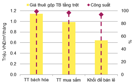 Giá thuê gộp trung bình tầng trệt tăng 4% theo quý và 12% theo năm trong khi công suất thuê duy trì ổn định theo năm và tăng 1 điểm % theo năm. Phân khúc trung tâm mua sắm ghi nhận hoạt động cải thiện nhất so với năm trước.