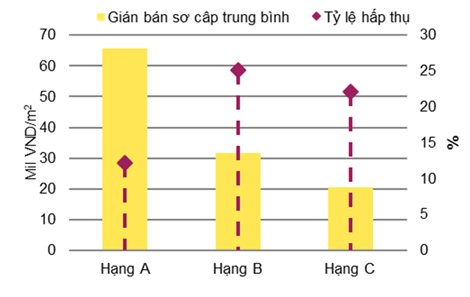 Số căn bán được giảm -16% theo quý nhưng tăng 11% theo năm. Tỷ lệ hấp thụ đạt 24%, giảm -4 điểm % theo quý và -1 điểm % theo năm. Giá chào bán trung bình đạt 1.330 USD/m2, tăng 6% theo quý và 5% theo năm. Hạng B tiếp tục chiếm lĩnh thị trường với hơn 60% thị phần, theo sau là hạng C với 33%.