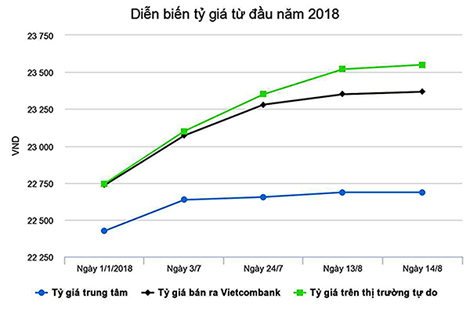 So với cuối năm 2017, tỷ giá trung tâm đã tăng 1,3%. Trong khi tỷ giá VND/USD tại các ngân hàng thương mại (NHTM) tăng 2,8%, còn tỷ giá trên thị trường tự do tăng 3,3%.