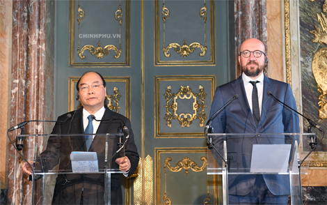 Tối 16/10, tại thủ đô Brussel, trong khuôn khổ chuyến thăm chính thức Vương quốc Bỉ, Thủ tướng Nguyễn Xuân Phúc và Thủ tướng Bỉ Charles Michel có cuộc họp báo chung.