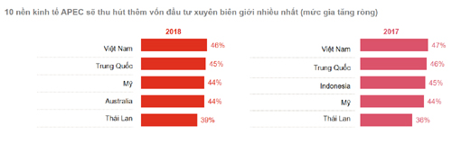 Ngoài việc nhìn nhận tích cực về khả năng tăng trưởng doanh thu, 51% lãnh đạo doanh nghiệp trong khu vực APEC đang có kế hoạch nâng mức đầu tư, cao hơn tỷ lệ 43% cách đây hai năm. Những điểm đến dự kiến thu hút đầu tư nước ngoài nhiều nhất trong khu vực APEC sẽ là Việt Nam, Trung Quốc, Mỹ, Australia và Thái Lan, trong đó Việt Nam giữ vị trí hàng đầu năm thứ hai liên tiếp.