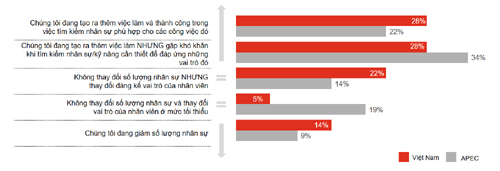 Thị trường việc làm cũng có triển vọng tích cực, với 56% lãnh đạo doanh nghiệp tại APEC (tỷ lệ ở Việt Nam cũng là 56%) cho biết họ đang tạo thêm việc làm và chỉ 9% (Việt Nam: 14%) chủ động cắt giảm nhân sự dưới tác động trực tiếp của công nghệ lên lực lượng lao động.