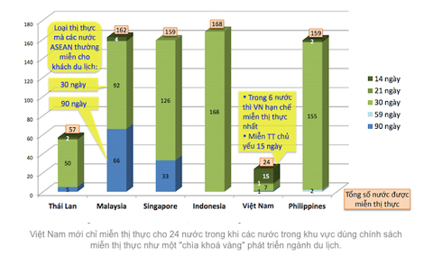 Trên thực tế, chính sách về cấp hay miễn visa của Việt Nam vẫn được đánh giá là còn nhiều hạn chế. Báo cáo vừa được công bố của Nhóm công tác Du lịch của Diễn đàn doanh nghiệp Việt Nam (VBF) 2018 cũng cho thấy, trong khối ASEAN, số lượng các quốc gia được miễn thị thực của Việt Nam chỉ đứng trên Lào, Campuchia, Myanmar và bị bỏ rất xa bởi những cái tên khác.