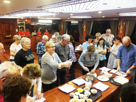 Không giống như những người du lịch trẻ tuổi, những người già phương tây bộc lộ niềm vui nhẹ nhàng thông qua việc hưởng ứng nhiệt tình các hoạt động nhẹ nhàng như chèo thuyền trên sông kayak ngắm vịnh Lan Hạ, tập yoga, taicha chào đón bình minh trên sundeck, học gói món nem truyền thống Việt Nam, câu mực đêm v.v.