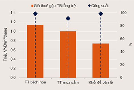 Giá thuê trung bình tầng trệt tiếp tục xu hướng đi lên với mức tăng 3% theo quý và 17 % theo năm trong khi công suất thuê giảm nhẹ -3 điểm % theo quý và -4 điểm % theo năm. Phân khúc khối đế bán lẻ ghi nhận hoạt động cải thiện nhất.