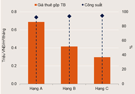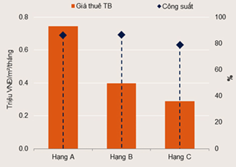 Thị trường tăng điểm nhẹ theo quý. Giá thuê trung bình đạt 25 USD/m²/tháng, tăng 5% theo năm. Trong khi đó, công suất trung bình ổn định tại 86%. Hạng C giảm -14% về lượng cung, giảm -17% về giá thuê.