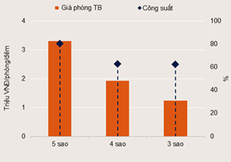 Công suất cho thuê trung bình tăng nhẹ 1 điểm % theo quý nhưng giảm -2 điểm % theo năm. Giá thuê phòng trung bình tăng 14% theo quý nhưng ổn định theo năm. Doanh thu phòng trung bình của phân khúc 5 sao đạt 116 USD/phòng/đêm, gấp đôi doanh thu của các khách sạn 4 sao và gấp ba lần các khách sạn 3 sao.