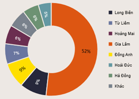 Huyện Gia Lâm dẫn đầu với lượng giao dịch đạt 52%, theo sau là Huyện Đông Anh và quận Long Biên với 9% thị phần tại mỗi địa phương.