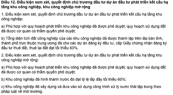 Điều 12, khoản 2, mục b Nghị định 82/2018/NĐ-CP quy định tỷ lệ lấp đầy tại các khu công nghiệp, khu kinh tế tối thiểu 60%.