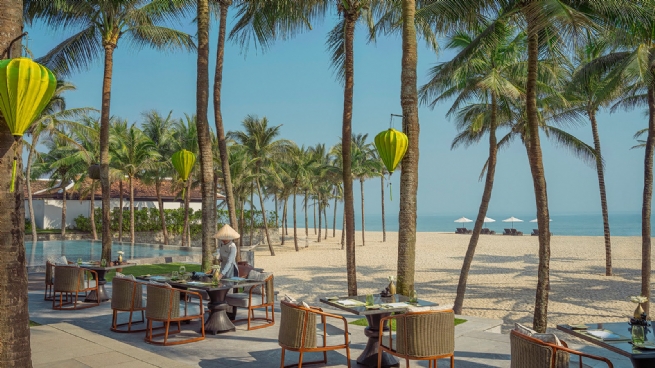 Trải nghiệm ẩm thực bên bờ biển tại Four Seasons The Nam Hải, Hội An mang đến không gian yên bình dưới những hàng dừa xanh mát, hướng trọn tầm nhìn ra bãi biển Hà My thơ mộng, hòa cùng tiếng sóng vỗ nhẹ nhàng cho một bữa ăn trọn vẹn
