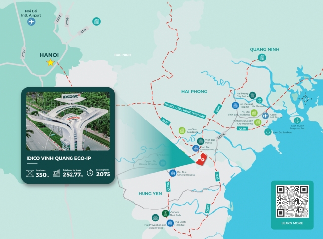 Cùng với lợi thế về mô hình phát triển, IDICO Vinh Quang còn sở hữu vị trí chiến lược khi nằm trong vùng kinh tế trọng điểm Bắc bộ, kết nối trực tiếp trục Hà Nội – Hải Phòng – Quảng Ninh. Dự án hưởng lợi từ hệ thống giao thông huyết mạch đa dạng, bao gồm đường bộ, đường biển và đường hàng không, cùng nguồn nhân lực địa phương dồi dào và sự đồng hành tích cực của chính quyền thành phố.