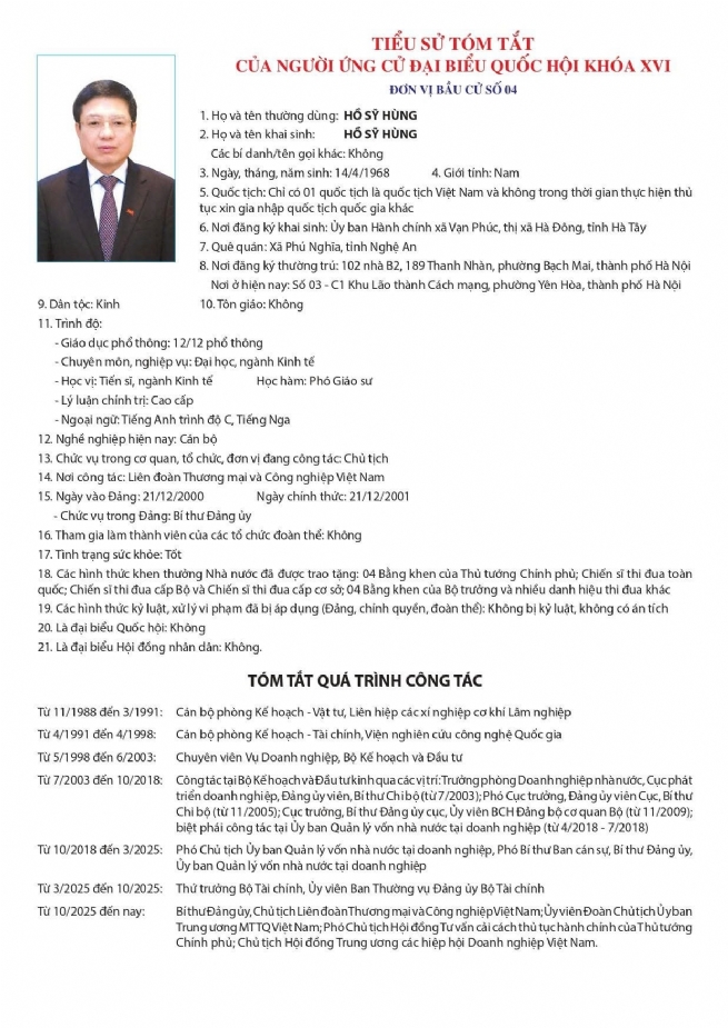 PGS TS Hồ Sỹ Hùng - Bí thư Đảng ủy, Chủ tịch VCCI tham gia ứng cử Đại biểu Quốc hội khoá XVI, nhiệm kỳ 2026 - 2031 tại đơn vị bầu cử số 4 TP Hà Nội.