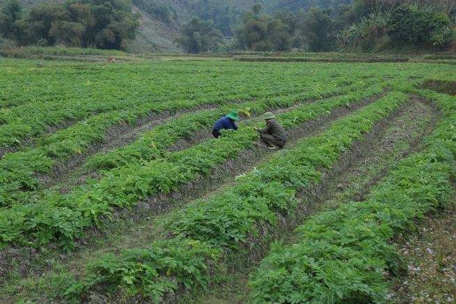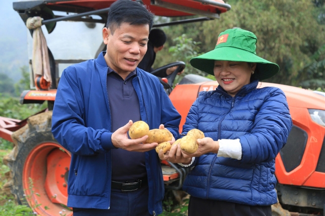 Ông Phạm Văn Cường – Phó chủ tịch UBND xã Văn Bàn thăm và chúc mừng thành công của mô hình liên kết trồng khoai tây của Hợp tác xã Quang Vinh
