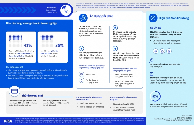Trong bối cảnh lạm phát gia tăng, lãi suất và áp lực thanh khoản, các Doanh nghiệp đang tăng trưởng tại khu vực châu Á – Thái Bình Dương (quy mô vừa với doanh thu hàng năm từ 50 triệu USD đến 1 tỷ USD) coi việc quản lý dòng tiền hiệu quả là thiết yếu, trong đó vốn lưu động trở thành một công cụ chiến lược giúp thúc đẩy tăng trưởng và khả năng phục hồi. Tuy nhiên, gần một nửa số doanh nghiệp tiềm năng trong khu vực vẫn chưa sử dụng bất kỳ giải pháp vốn lưu động, dù nhu cầu tiếp cận nguồn vốn linh hoạt ngày càng tăng.