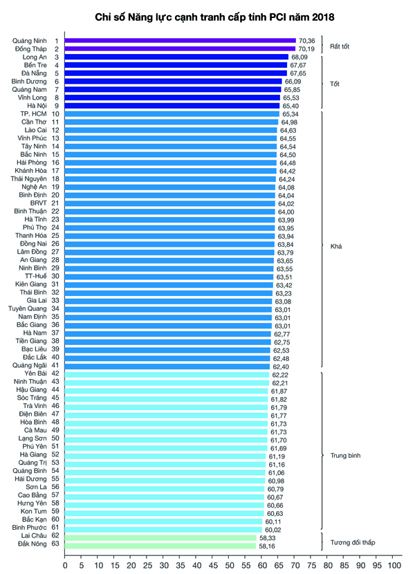 Theo ông Đậu Anh Tuấn, Trưởng ban Pháp chế VCCI, Giám đốc dự án PCI đánh giá, các tỉnh đồng bằng sông Cửu Long luôn nằm trong top đầu của bảng xếp hạng trong nhiều năm gần đây. Long An (68,09 điểm) và Bến Tre (67,67 điểm), hai tỉnh giữ vị trí thứ 3 và 4 trên bảng xếp hạng đều tăng 1 bậc so với năm 2017.