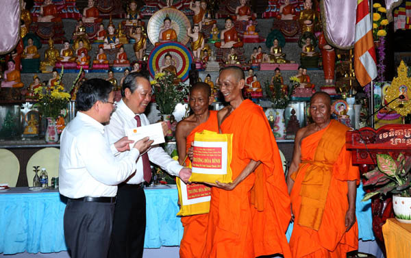 Đến thăm các vị chư tăng, sư sãi và đồng bào Khmer tại chùa Âng (tỉnh Trà Vinh) và chùa Khmer Candaransi tại TPHCM, Phó Thủ tướng Thường trực Chính phủ Trương Hoà Bình nhắc lại sự quan sâu sắc của Đảng và Nhà nước đối với đời sống vật chất, tinh thần của đồng bào các dân tộc thiểu số nói chung và đồng bào Khmer nói riêng thời gian qua.