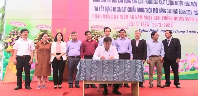 Sau 8 năm thực hiện xây dựng Nông thôn mới (NTM), huyện đã huy động gần 1000 tỷ đồng; 11/11 xã đều đạt chuẩn NTM, đưa Nghĩa Hành cán đích và trở thành huyện đầu tiên của tỉnh Quảng Ngãi đạt chuẩn huyện NTM vào năm 2018. Sau khi được công nhận huyện NTM, ở nửa cuối nhiệm kỳ 2015- 2020 Nghĩa Hành nỗ lực thực hiện xã NTM nâng cao và khu dân cư kiểu mẫu, phấn đấu đến năm 2030 trở thành huyện NTM nâng cao.