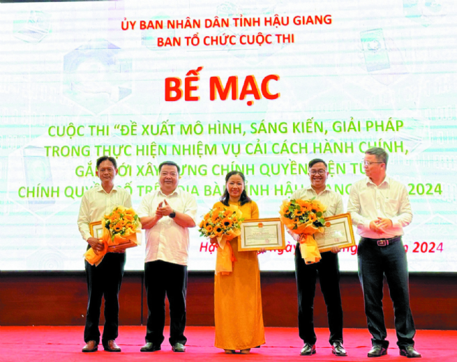 Ông Nguyễn Minh Trí, Giám đốc Sở Nội vụ (thứ 2 từ trái qua) và các đơn vị đạt giải cuộc thi “Đề xuất mô hình, sáng kiến, giải pháp trong thực hiện nhiệm vụ cải cách hành chính gắn với xây dựng chính quyền điện tử, chính quyền số trên địa bàn tỉnh Hậu Giang” năm 2024